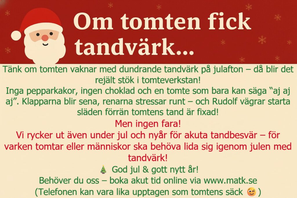Vi hjälper dig med akuta tandbesvär under jul och nyår röda dagar! Boka din akuttid själv nedan!