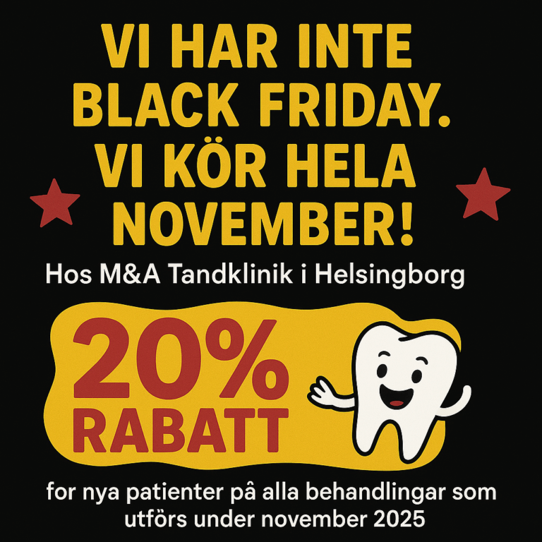 Erbjudandet gäller alla nya patienter som skickar till oss via formuläret nedan. Gäller inte akuta patienter. Vi har väldigt begränsade antal platser. Vi tar emot nya patienter så länge formuläret nedan är tillgänglig på denna sida. Välkommen hos M&A Tandklinik i Helsingborg